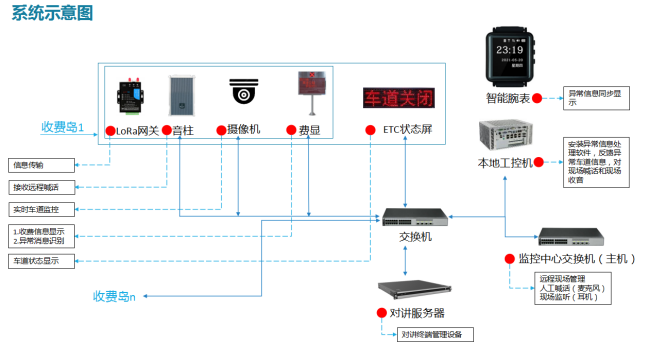 該系統(tǒng)由費額顯示系統(tǒng)、語音提示系統(tǒng)、無線通信系統(tǒng)、車道狀態(tài)屏、車道引流屏共同組成。當收費車道出現(xiàn)異常,管理人員通過“智能腕表”同步接受異常提示,費額顯示器、車道狀態(tài)屏顯示異常信息,同步到收費站前的車道引流屏提醒車輛收費車道通行情況,防止車輛持續(xù)涌入導(dǎo)致?lián)矶隆?/p>